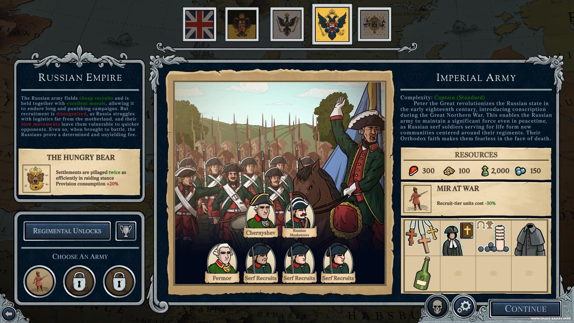 * 150 исторических подразделений: Нанимайте войска из обширного списка европейских армий XVIII века — каждая с уникальными характеристиками, ролями и внешним видом.